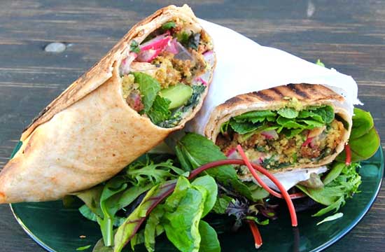 A Fafel Sandwich with Salad. Made for one person but can be divided as a side dish. Whole and half come wrapped in paper.