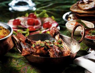 Tandoori marinated Chicken with Garlic, Ginger and Garam Masala. Includes aromatic basmati-rice and raita.