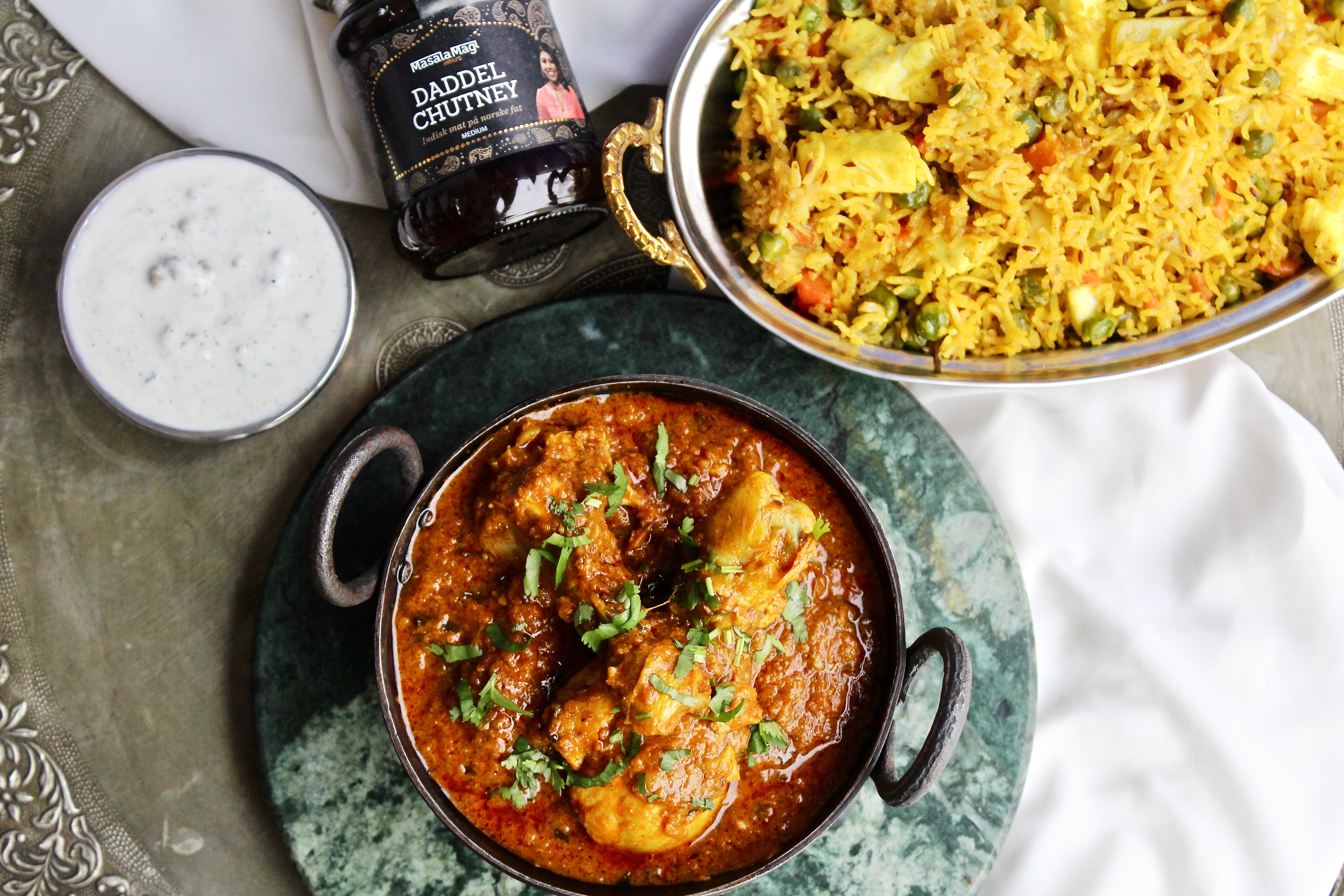 Chicken served in a magnificent curry sauce consisting of Onions, Tomatoes, Ginger and Nirus Garam Masala. Includes Basmati-rice and Raita.