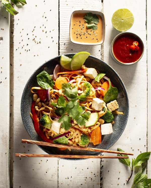 Tempeh, Five Spice Explosion sauce, rice noodles and veggies. Topped with spring onion, sesame seed mix and lime.